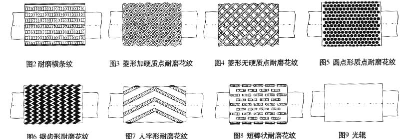 目前国内外常用的辊面耐磨花纹形式如图所示,客户可根据具体情况自主选择;